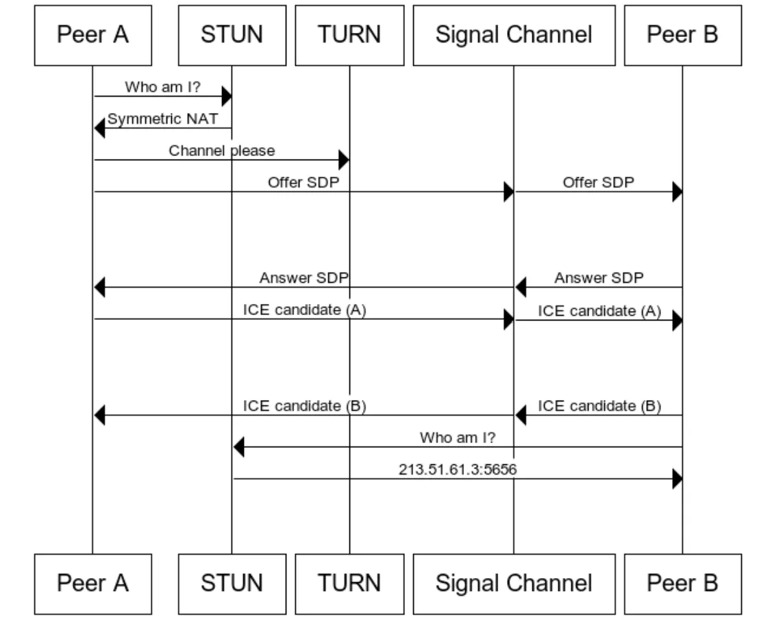 따라서 브라우저 두 개가 서로 직접적인 통신을 하기 위해서는 각자 연결된 라우터의 공인 IP주소와 포트를 먼저 알아내야 합니다.