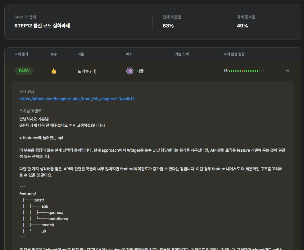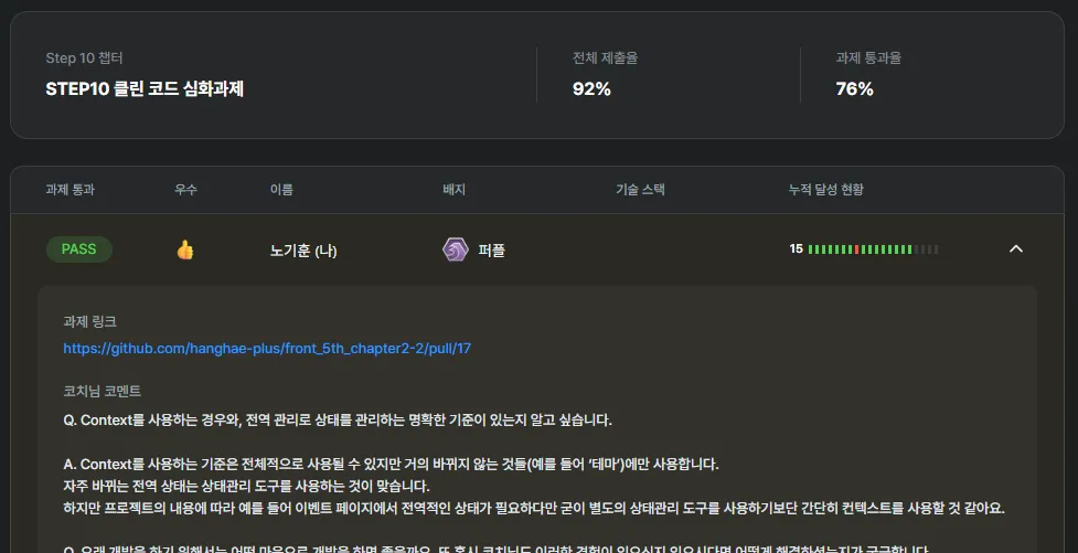 이번 5기에는 블랫뱃지에 대한 기준이 올라가 과제 통과 100%, BP(Best Practice) 2개를 받아야 했으며,