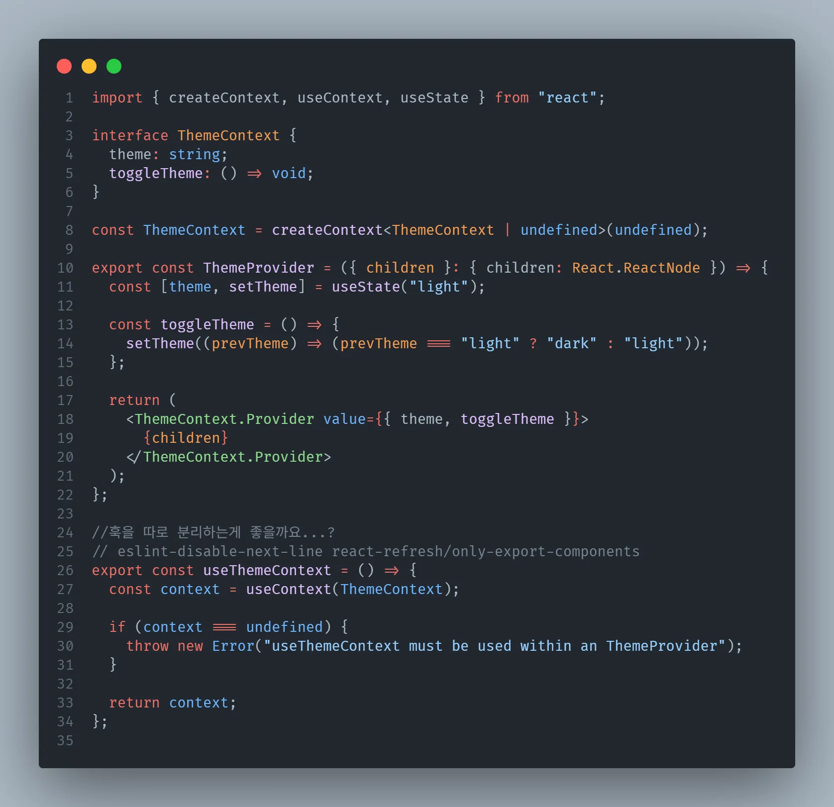위와 같이 텍스트, 프로바이더, 컨텍스트 훅을 한 파일에서 관리하는 코드를 작성하며 다음과 같은 고민을 하여 과제 피드백을 요청드리게 됩니다.